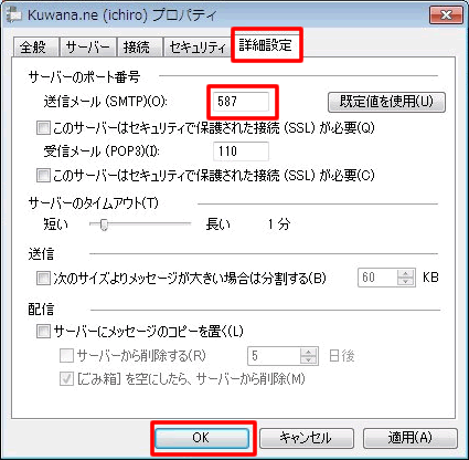 [詳細設定]タブを選択し、送信メールのポート番号が【587】になっているかを確認し、[OK]をクリックします。